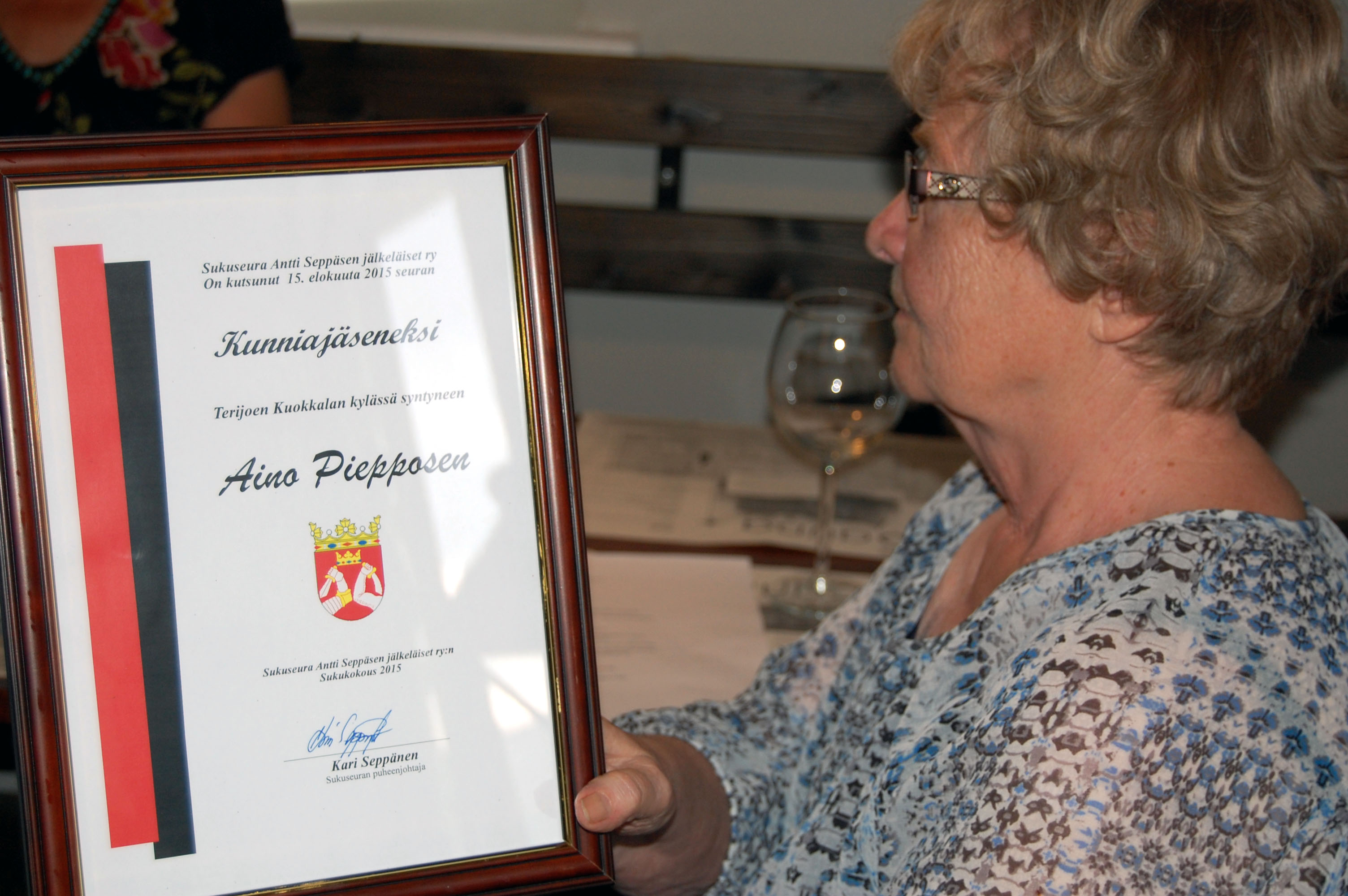Edellisen sukukokousen kunniajäseneksi hyväksymä Aino Piepponenkin sai vihdoin oman, kehystetyn kunniakirjan, jonka lupasi toimittaa Ainolle itselleen hallituksen jäsen Marja Mäkinen.