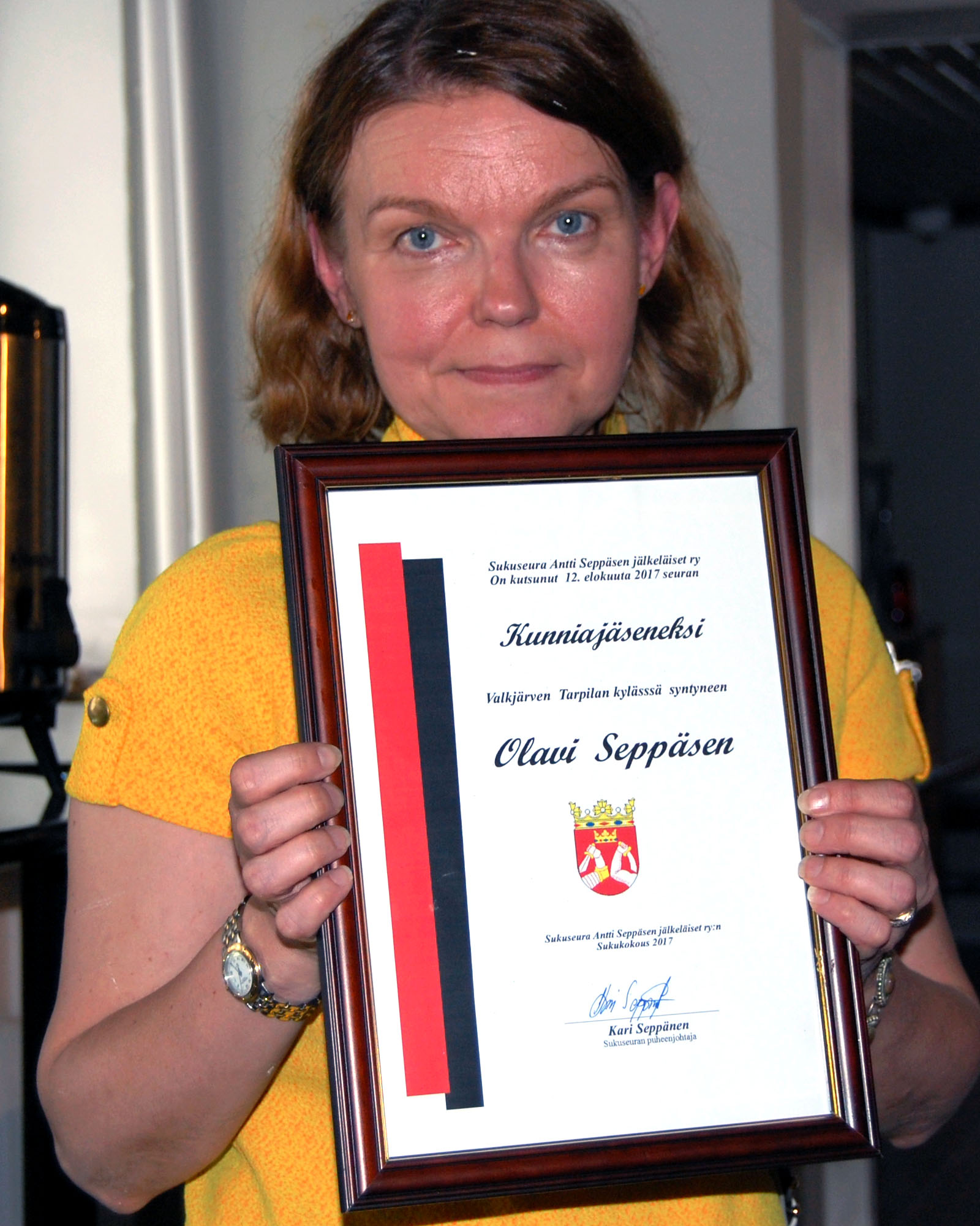 Kokouksen lopussa valittiin hallituksen esityksestä Sukuseura Antti Seppäsen jälkeläiset ry:n kunniajäseneksi seuramme perustajajäsen, Valkjärven Tarpilan kylässä syntynyt Olavi Seppänen. Hänen ansiokseen todettiin pitkäaikainen suvun taustojen selvittäminen ja yhteydet sukuhistorian kirjoittajaan Aimo Seppäseen ja hänen sisareeseen sukututkija Helmi Seppäseen. Olavilla oli myös suuri rooli sukuseuramme perustamisessa. Valitettavasti Olavi ei ikänsä ja kuntonsa puolesta enää kyennyt saapumaan paikalle. Hänen sijastaan kunniakirjan otti vastaan tytär Sari Peltomäki, joka kiitti isänsä puolesta ja kertoi tämän arvostavan suuresti saamaansa huomionosoitusta.