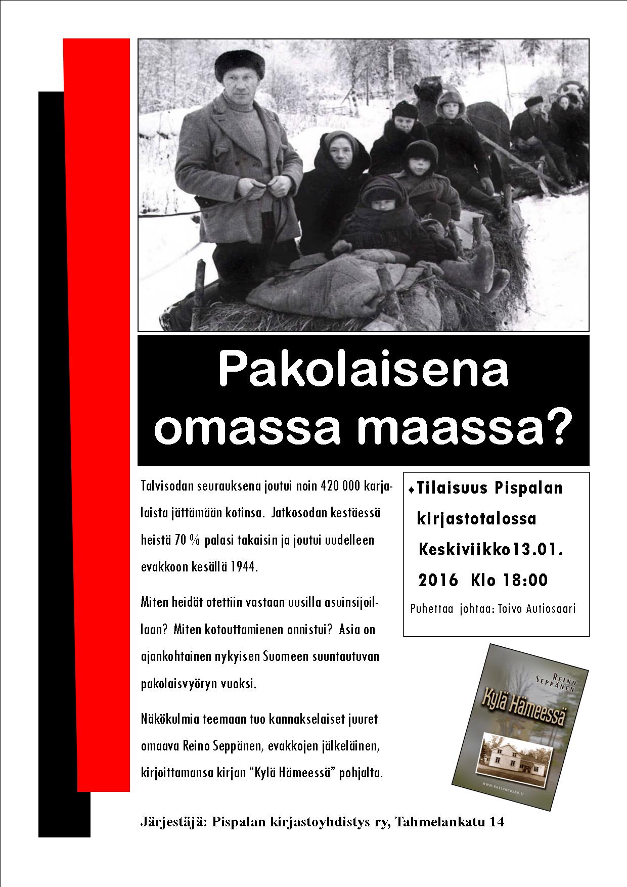 Pispalan kirjastoyhdistys ry järjestää keskiviikkona 13. tammikuuta 2016 tilaisuuden evakkojen sopeutumisesta kanta-Suomeen sotien jälkeen. Tilaisuuden alustaa yhdistyksemme sihteeri Reino Seppänen. Alustuspyynnön taustalla on Seppäsen vuonna 2014 julkaistu romaani ”Kylä Hämeessä”. Tilaisuuden puheenjohtajana toimii kirjastoyhdistyksen aktiivi Toivo Autiosaari.